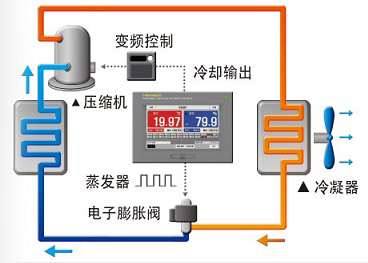 以加熱·冷卻輸出控制變頻器與調節電子膨脹閥,控制各區間的冷媒量 來調節被浪費的加熱量及控制冷凍機來實現節能。(變頻控制為選項) |